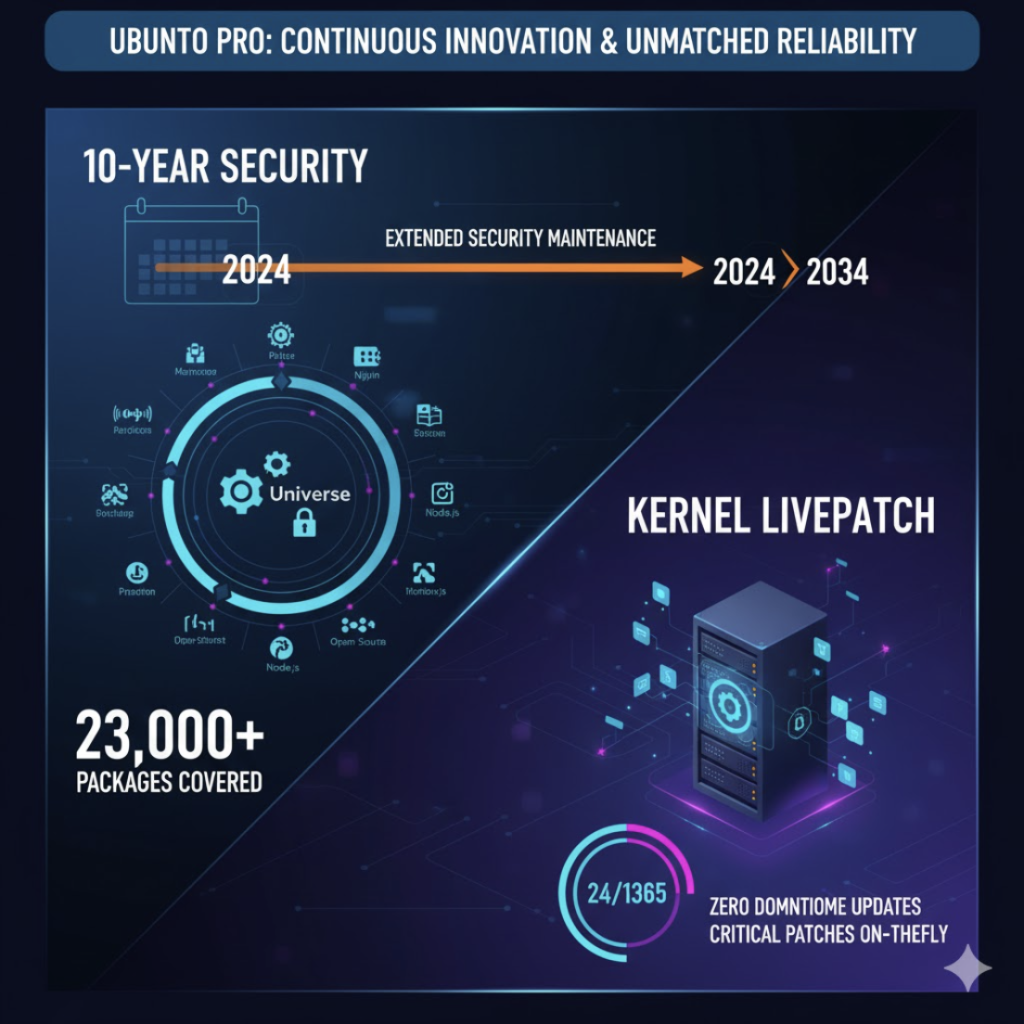 Ubuntu Pro คือ Subscription Service ที่ออกแบบมาสำหรับองค์กรและภาคธุรกิจโดยเฉพาะ โดยมุ่งเน้นการให้บริการ 3 ด้านหลักที่สำคัญที่สุด ได้แก่:
