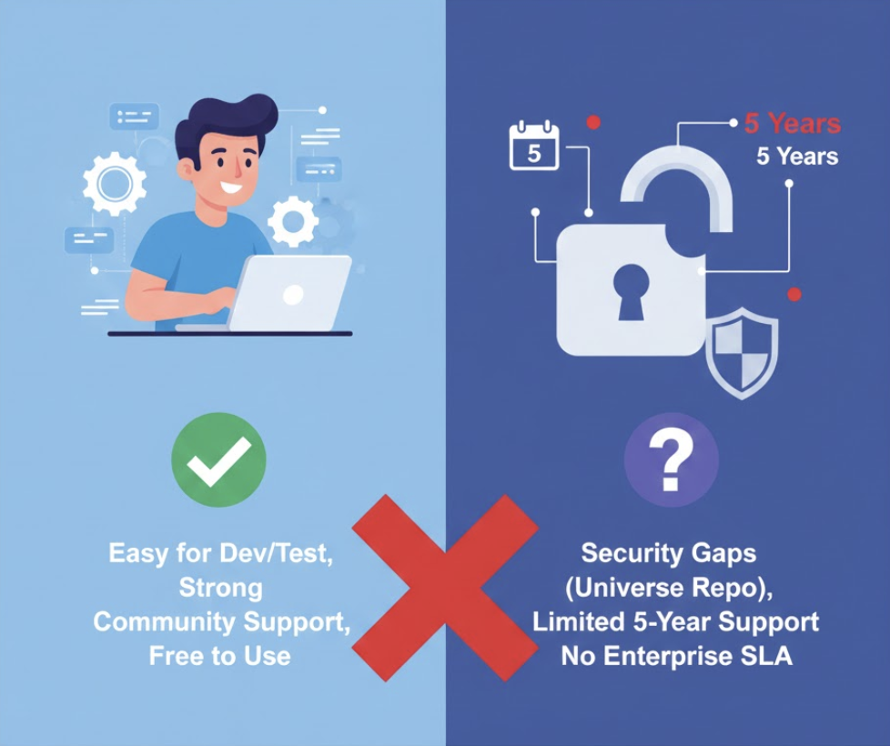 - Security Gap: รองรับความปลอดภัยเฉพาะแพ็คเกจใน “Main” repository เท่านั้น แต่ซอฟต์แวร์โอเพนซอร์สกว่า 23,000 ตัวใน “Universe” repository (เช่น MongoDB, NGINX, Node.js) ไม่ได้รับการการันตีแพตช์ความปลอดภัย จาก Canonical
