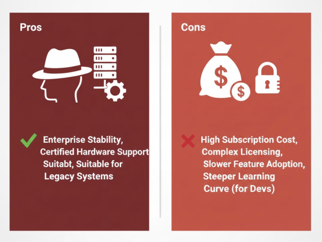 - ข้อดี: ความเสถียรสูงมาก, การรับรองฮาร์ดแวร์และซอฟต์แวร์ (ISV Certification) กว้างขวาง, เหมาะกับระบบ Legacy เดิม